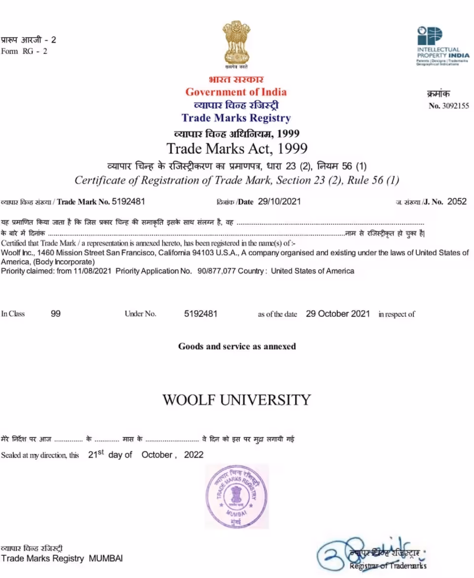 Woolf University is a registered and trademarked entity with the following: