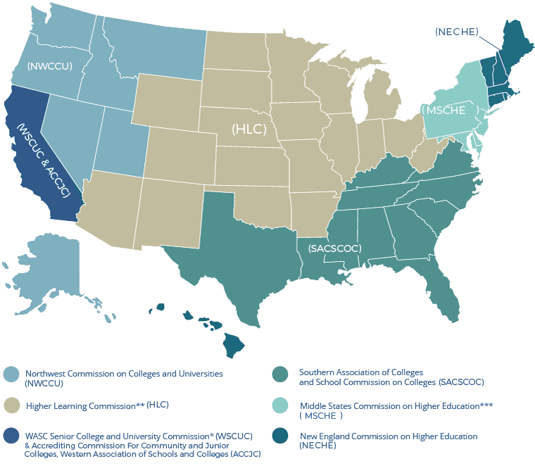 Regional accrediting commissions have long been considered the most prominent type of accrediting body in the United States. There are seven regional accrediting commissions that have historically operated across six regions: New England, Middle States, North Central, Southern, Western and Northwest.